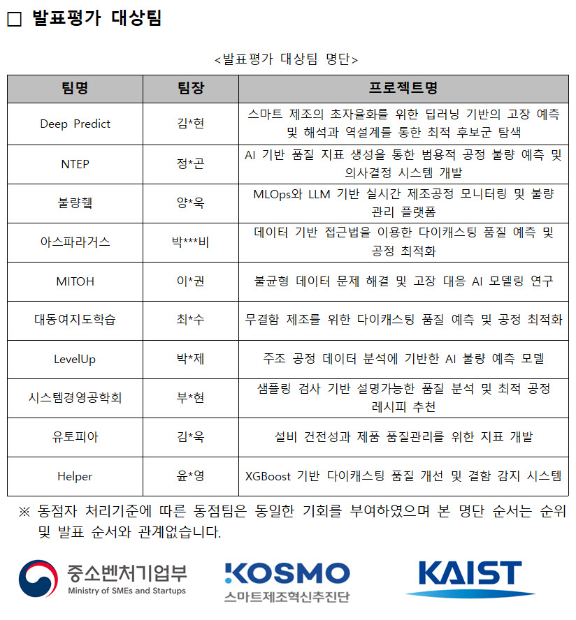 2024년 제4회 K-인공지능 제조데이터 분석 경진대회에 보내주신 많은 관심과 참여에 감사드립니다. 서면평가를 통해 선정된 10개의 발표평가 대상팀 명단을 아래와 같이 공지드립니다.