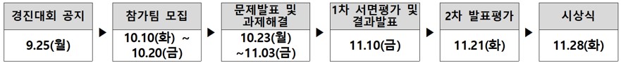 ◦ 신청방법 : 인공지능 중소벤처 제조플랫폼(KAMP, Korea AI Manufacturing Platform) 포털을 통한 온라인 접수* * KAMP 포털 로그인 후 상단 메뉴의 KAMP 서비스 - KAMP 경진대회